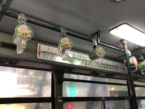 バスや電車の中には、宣伝広告があるのは、ベトナムも同じ。 そして、おもしろいものを発見しました。 当然カップ麺の宣伝です。 つり革にカップ麺が入っていますよ! つり革の形まで専用のものにして。 これを見たら、カップ麺が食べたくなりますねえ。 え…