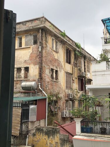 8 窓から見える景色が、ささやかなベトナムの景色。 この建物、趣がありますねえ。 ベトナムの建築物は、煉瓦でつくってコンクリートを上から塗るのがほとんど。(新しいものはわかりませんが) 中のレンガが出てきていますね。それが、遺跡のような趣を出し…